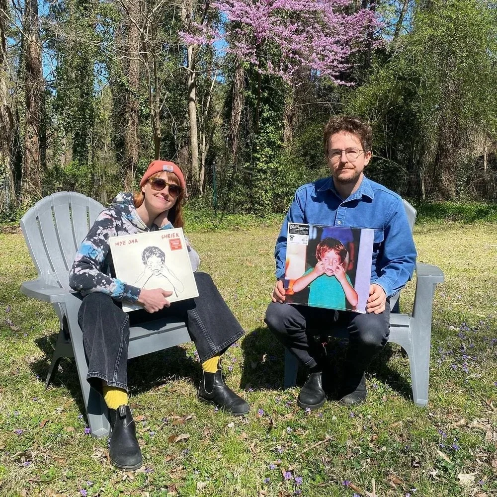 Jenn Wasner and Andy Stack from Wye Oak show off the original vinyl Shriek (2014) and Shriek Variations (2024).