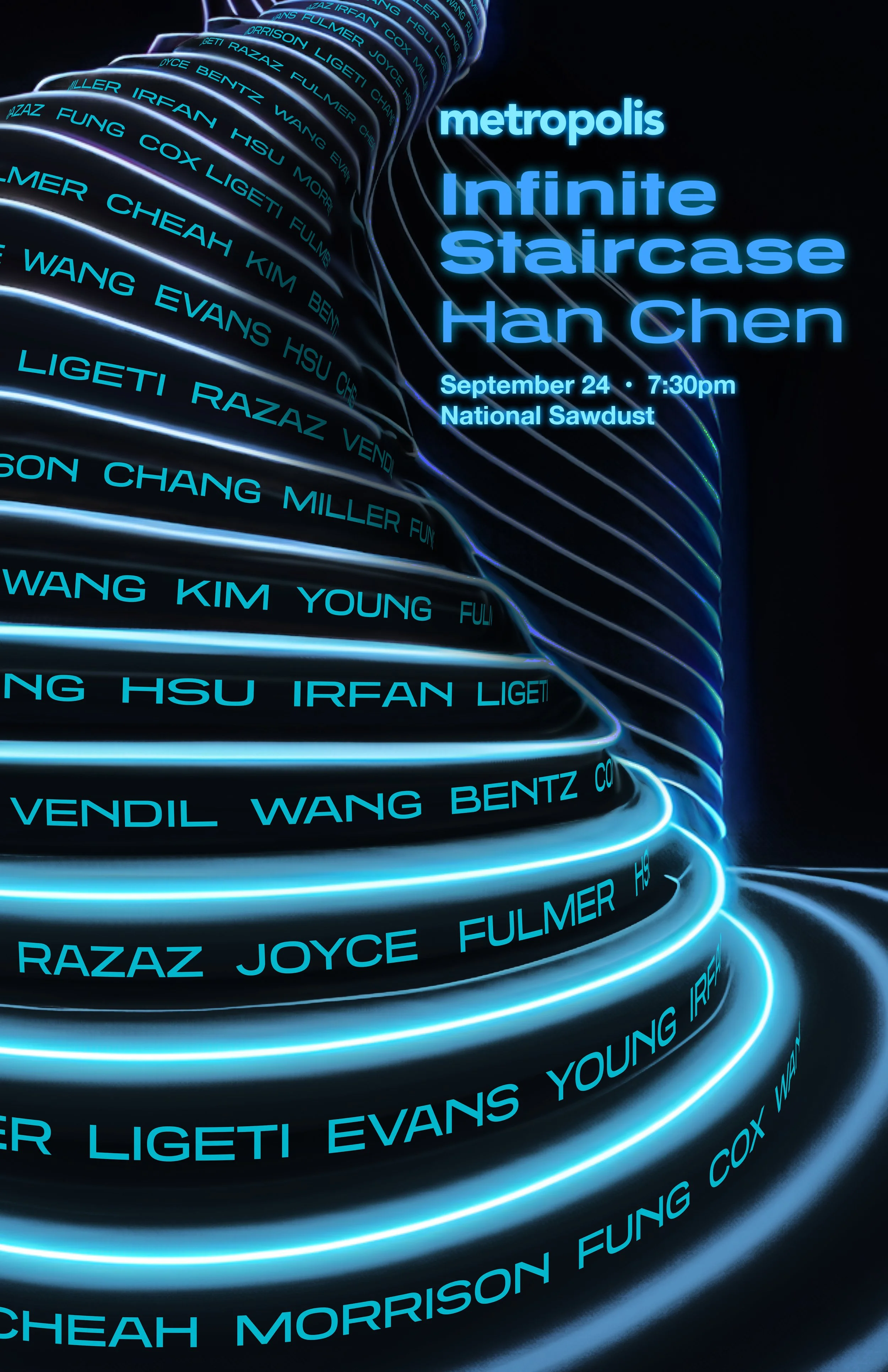 "Infinite Staircase" is co-commissioned by Metropolis Ensemble and Han Chen, with an additional Metropolis commission for ambient music by Phong Tran.
